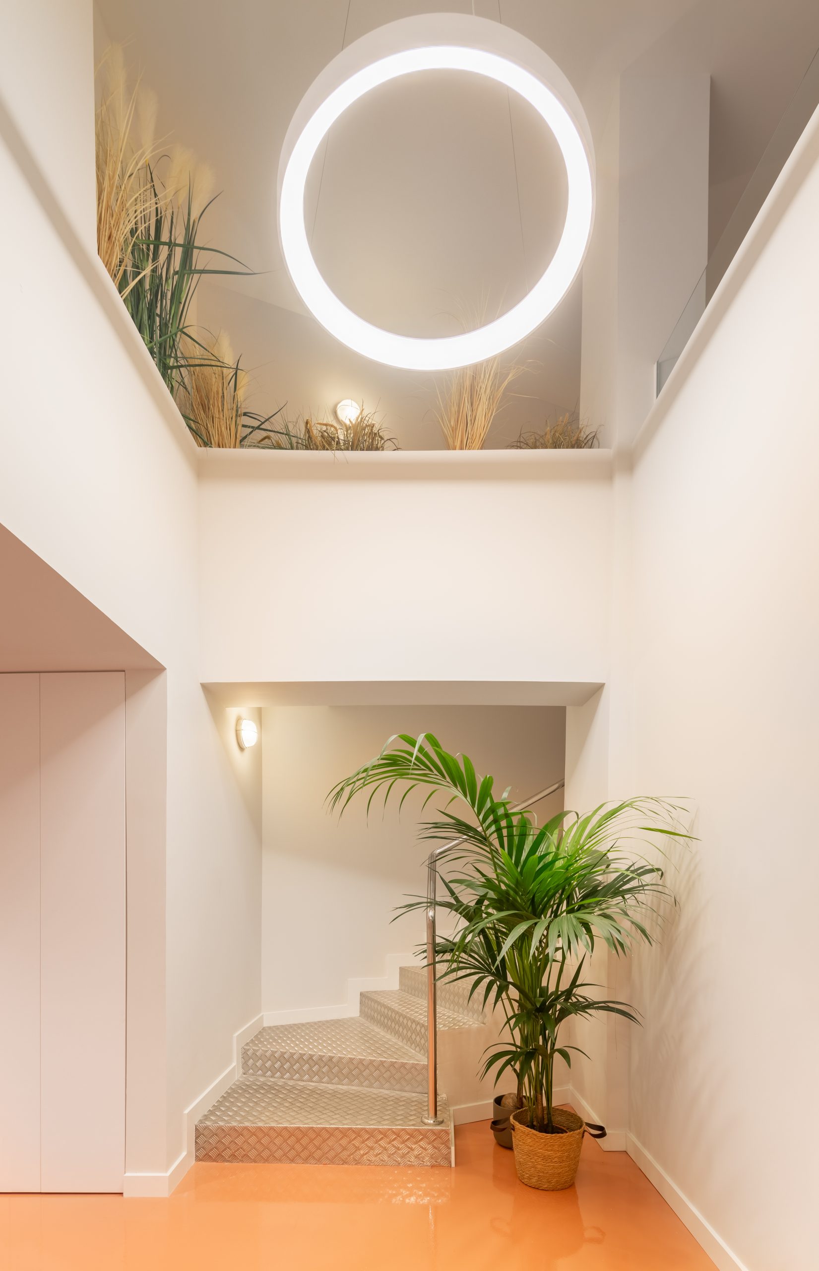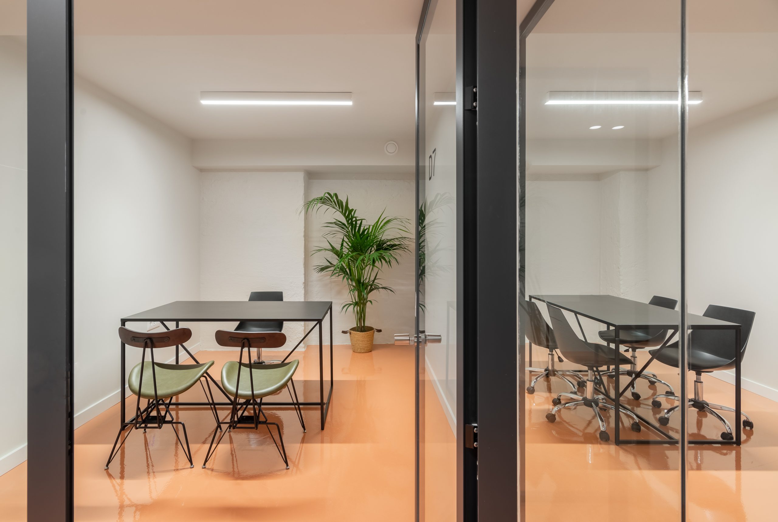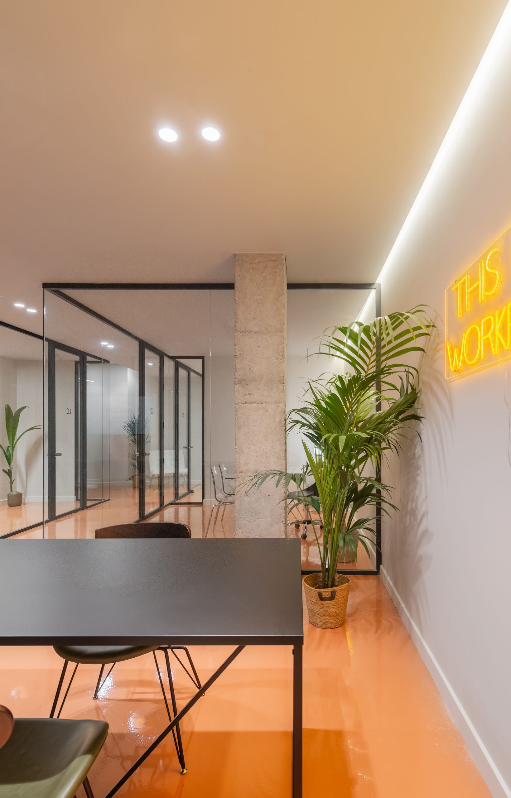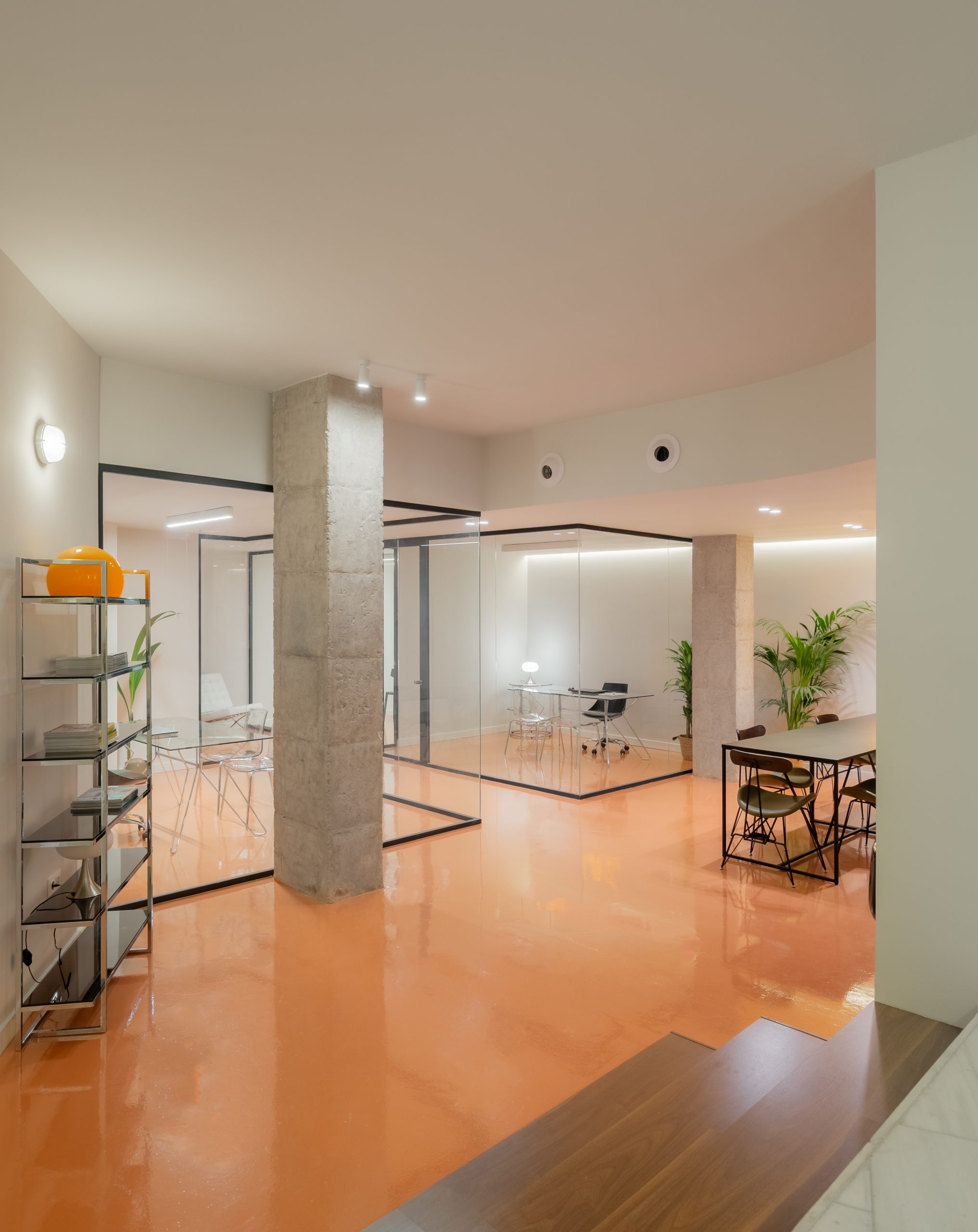 La propuesta articula los espacios a través de tabiques acristalados que maximizan la entrada de luz y fomentan la transparencia visual entre los distintos ambientes. El uso de mobiliario ligero y líneas puras refuerza la atmósfera abierta y dinámica del conjunto, mientras que elementos naturales, como la vegetación interior, aportan calidez y confort.